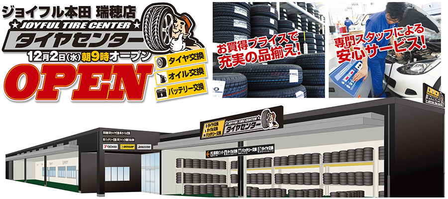 瑞穂店に『タイヤセンター』がオープンいたしました! 12月2日(水)、瑞穂店に『タイヤセンター』がオープンいたしました。お買い得プライスで充実の品揃え! 専門スタッフによる安心サービス! タイヤ、オイル、バッテリーの交換はぜひお任せください! 〒190-1212 東京都西多摩郡瑞穂町殿ヶ谷442(ジョイフル本田瑞穂店併設・ジャパンミート横) TEL:042-568-0301 営業時間:9:00~19:30