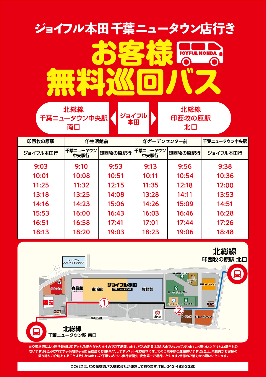 「千葉ニュータウン中央駅南口」と「印西牧の原駅北口」からお客様無料巡回バスを運行しております。