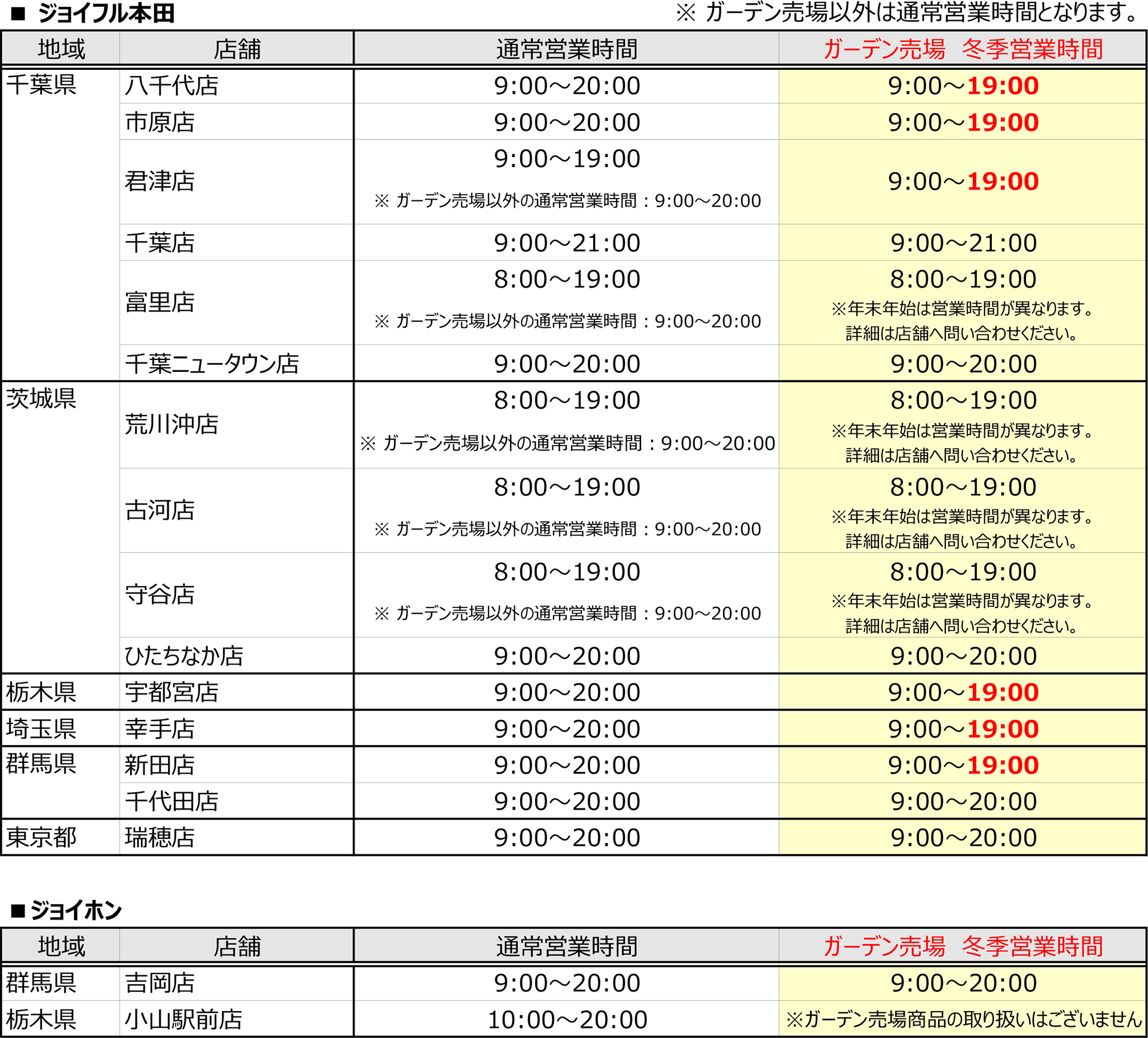一部店舗において、冬季期間のガーデン売場営業時間を下記の通り変更させていただきます。